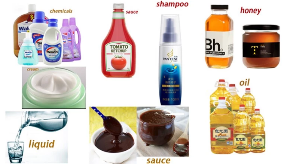 Semi-viscous at malapot na likido; catsup, mustasa, syrups, salsa, mayonesa, honey, peanut butter, jellies, dipping sauces, lip balm, shampoo, makapal na soaps, styling gels, facial mask, waks, pandikit, grasa, sealants, silicone at marami pa